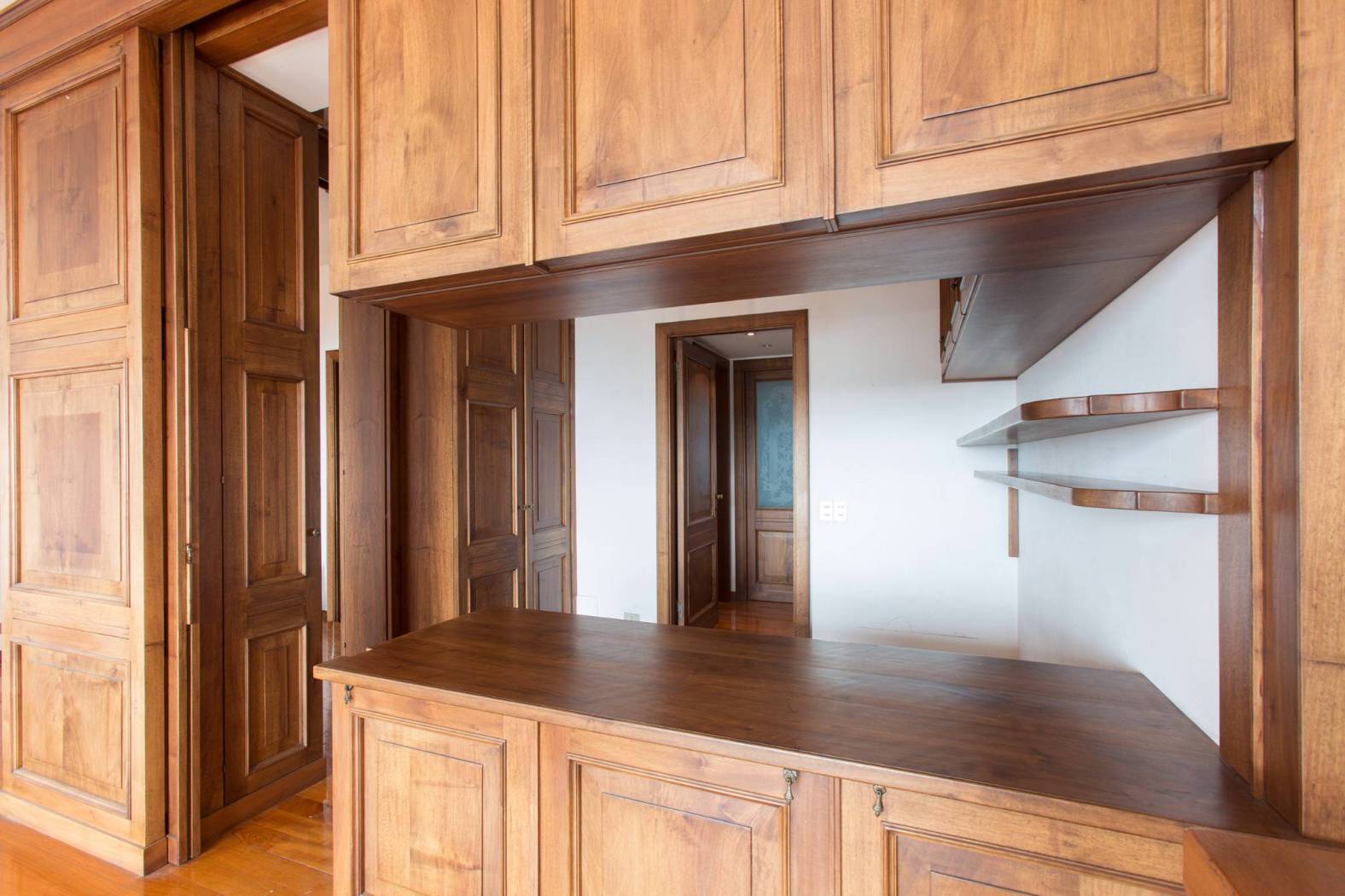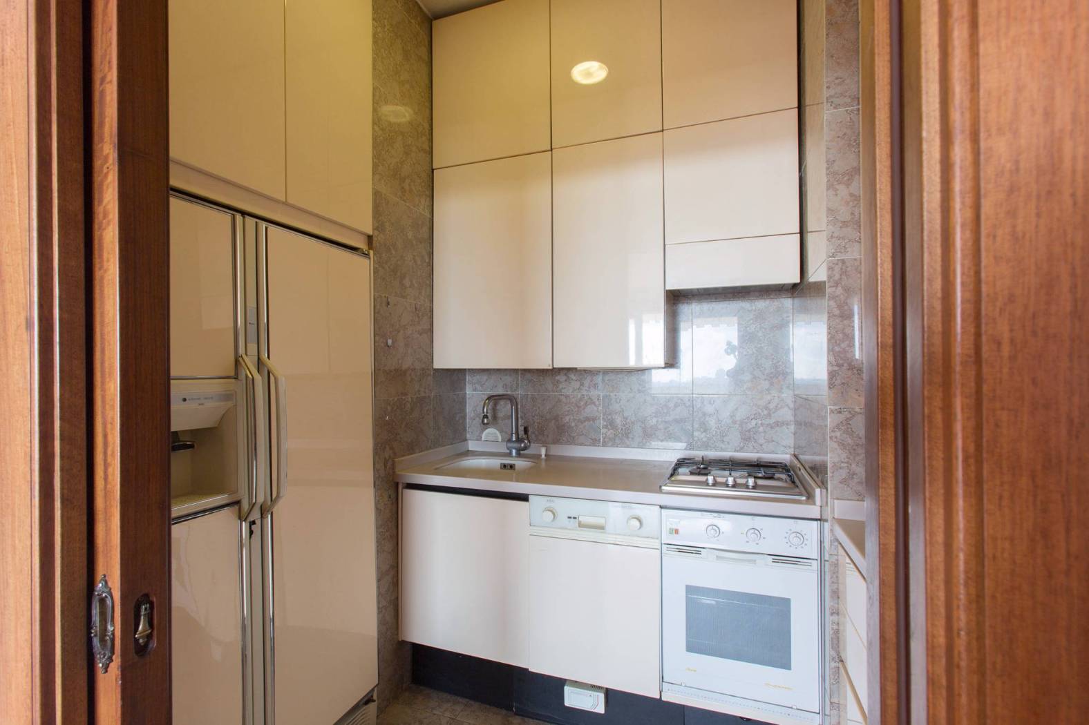 Attualmente si accede dall'ingresso al doppio soggiorno ove sono presenti ampie finestre panoramiche e due porte finestre che lo collegano al terrazzo di circa 10 mq con godevole utilizzo. Porte-pareti a scomparsa e mobili su misura in noce massello che si integrano nei pilastri esistenti creano una zona studio/ospiti con vista sul salotto. Un disimpegno serve la zona notte ove troviamo una camera matrimoniale un bagno padronale di notevole ampiezza, finestrato con doccia. Dalla zona di ingresso si accede infine ad un cucinotto attrezzato a servizio della zona pranzo inserita nel soggiorno. E' presente un secondo balcone di 10 mq. da cui si accede all'ingresso e ascensore di servizio.