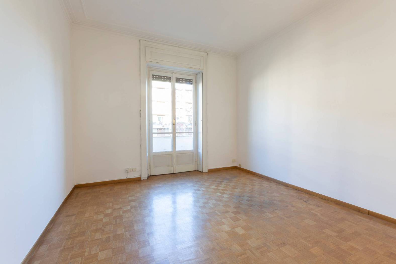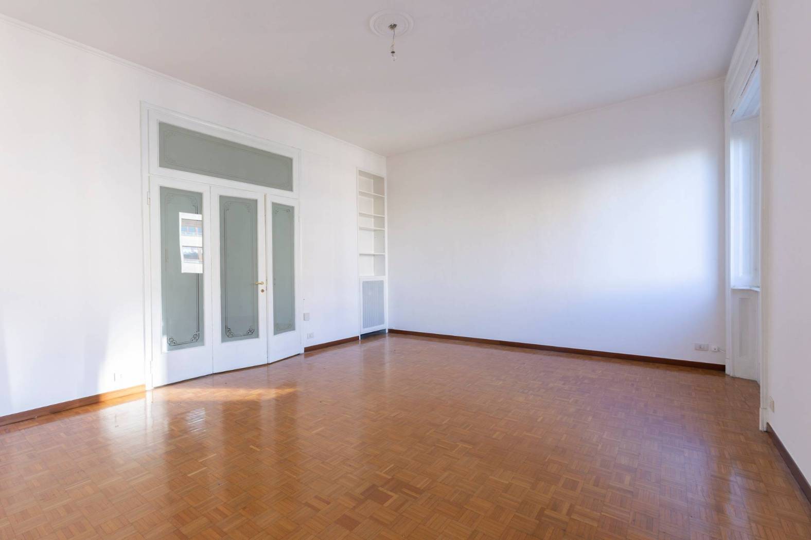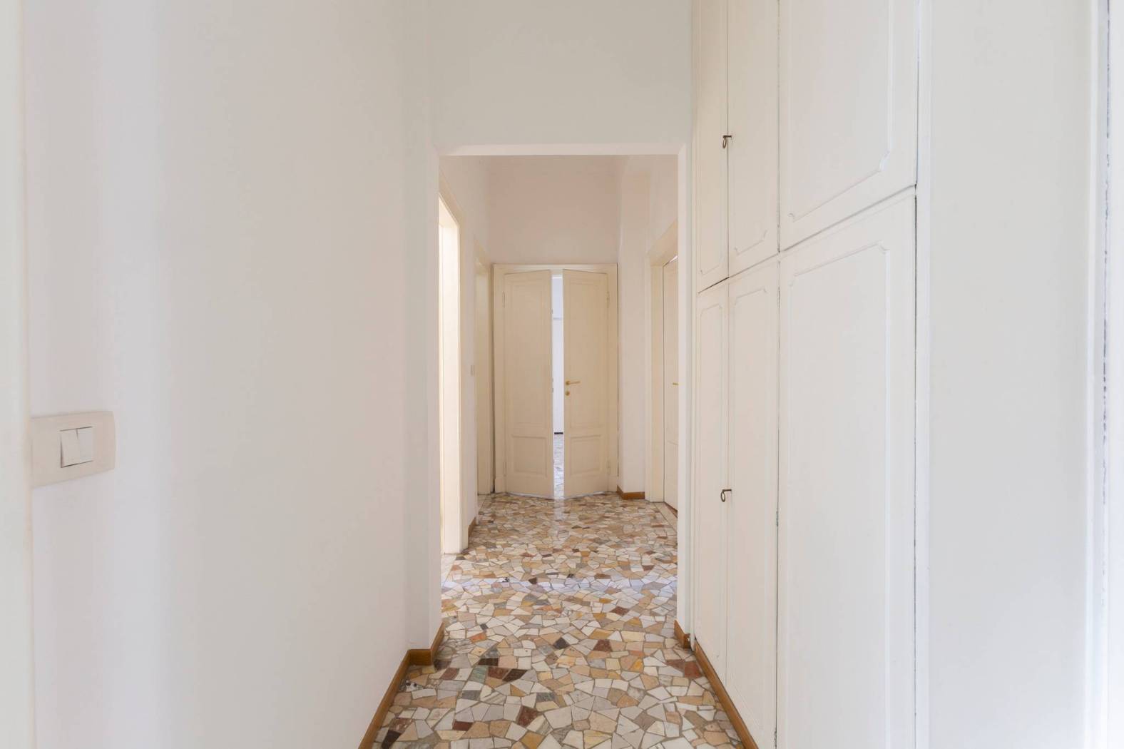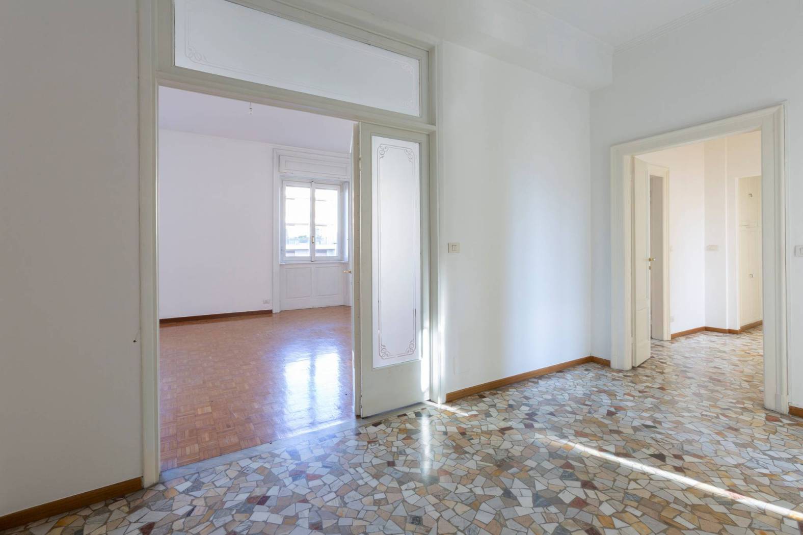 La porzione immobiliare di 150 mq. è posta al quinto piano e gode di una doppia esposizione. Un ampio ingresso conduce al soggiorno doppio con zona pranzo ed ad un'ampia cucina arredata con accesso ad un balcone di servizio.