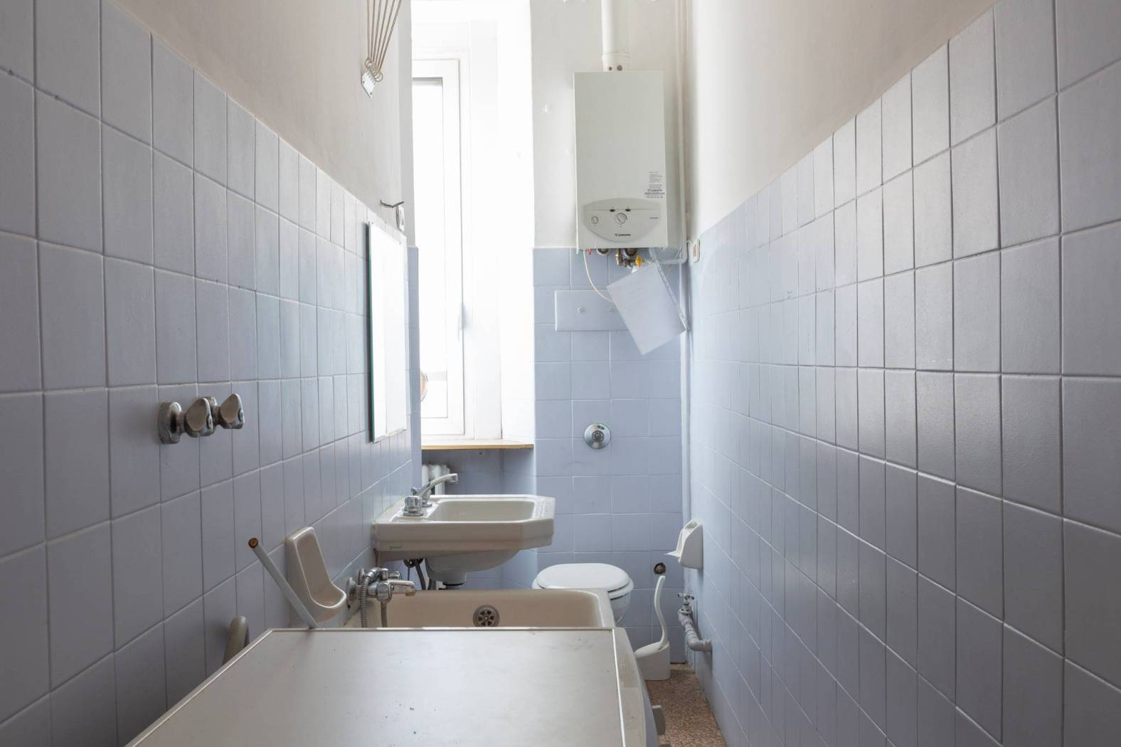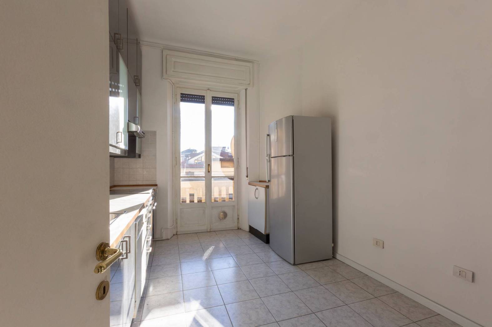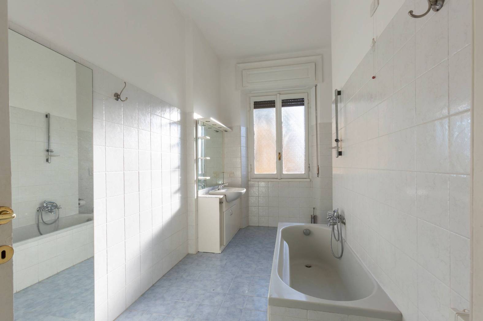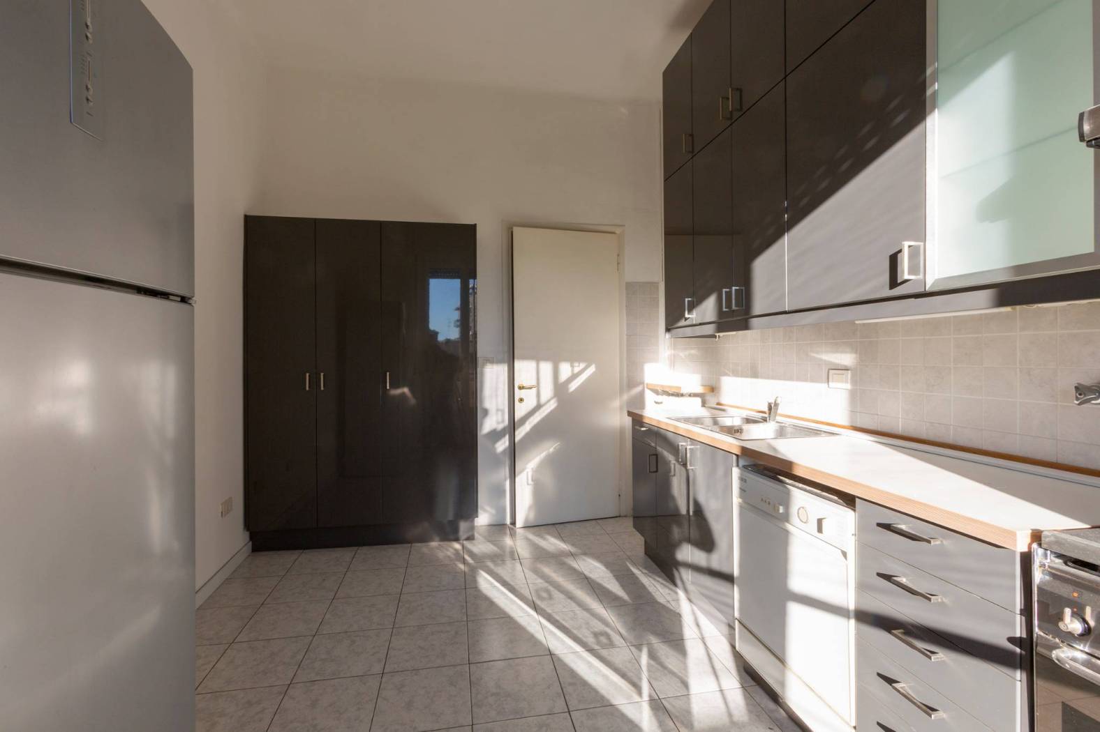 La porzione immobiliare di 150 mq. è posta al quinto piano e gode di una doppia esposizione. Un ampio ingresso conduce al soggiorno doppio con zona pranzo ed ad un'ampia cucina arredata con accesso ad un balcone di servizio.
