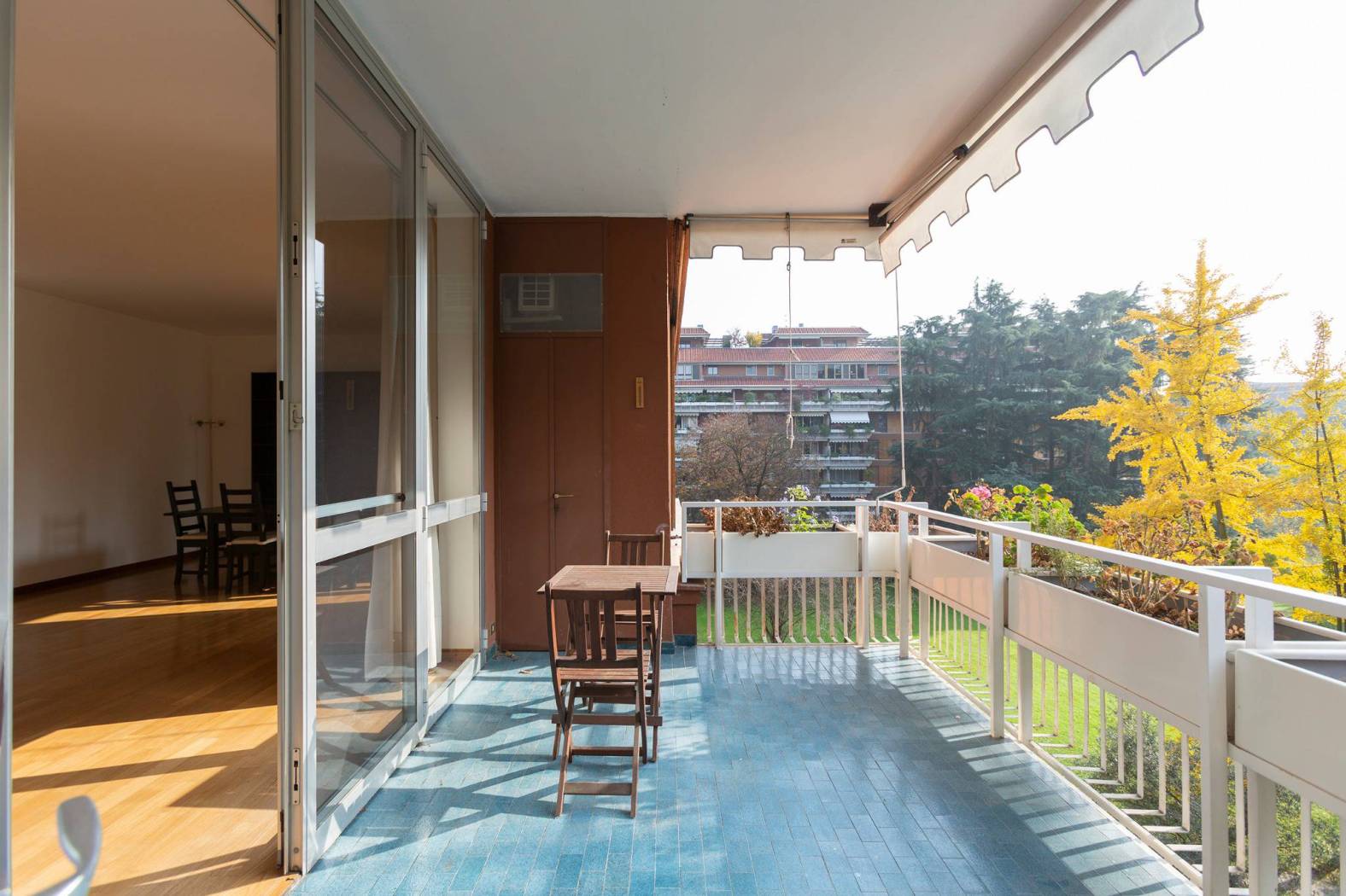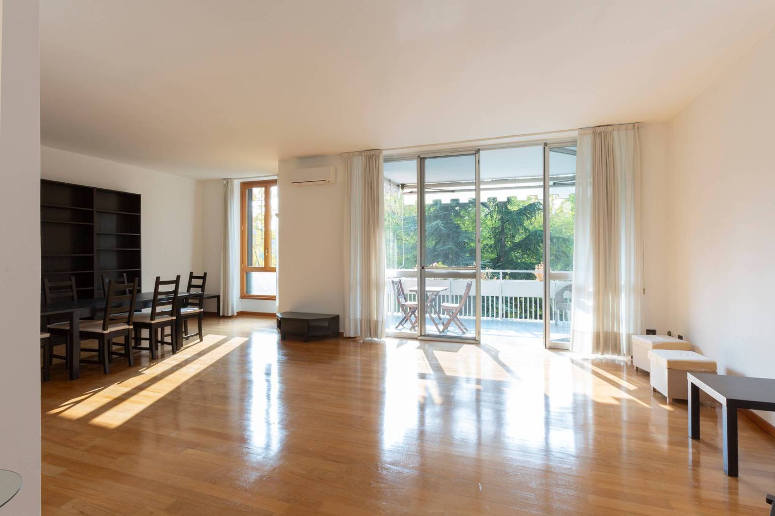 Dall'ingresso si accede direttamente ad uno spazioso e luminoso soggiorno doppio con zona pranzo e vetrate di accesso ad un ampio e soleggiato terrazzo con affaccio sul contesto e giardino condominiale.