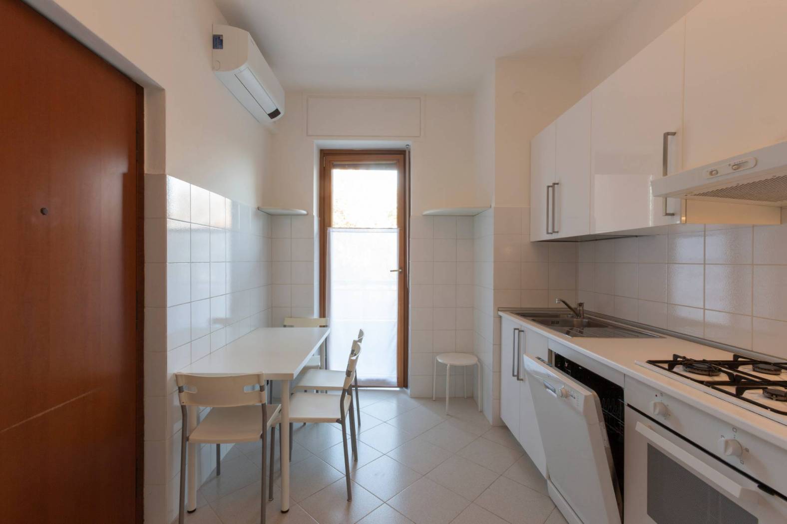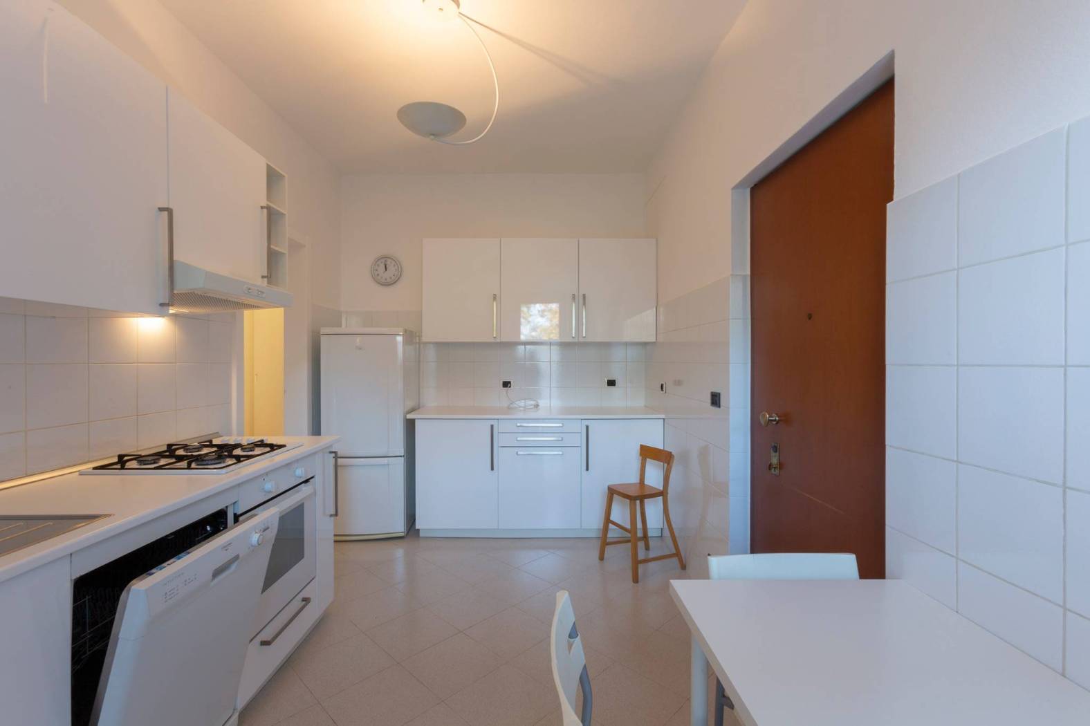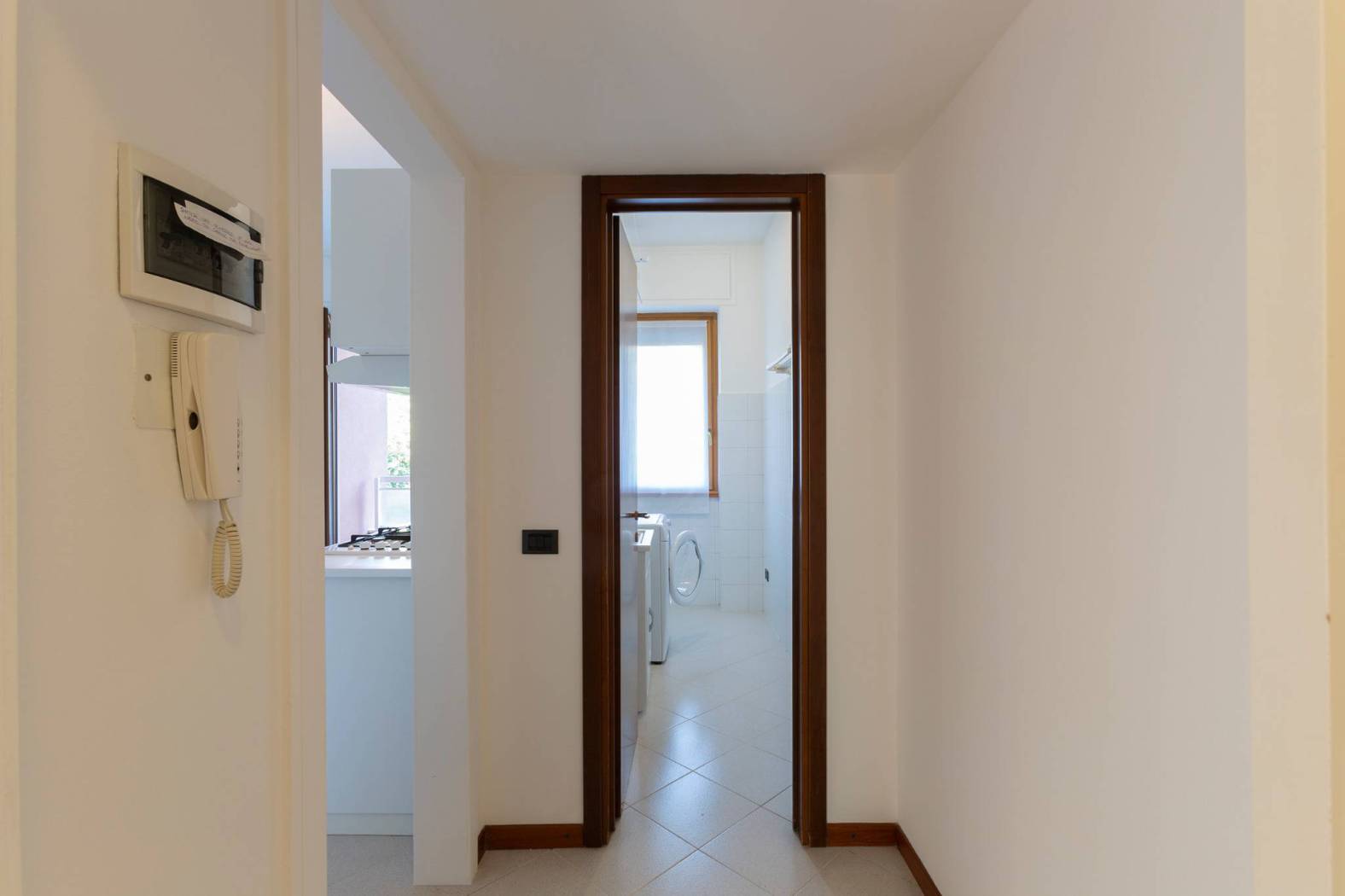Proseguendo nella descrizione, dalla zona di ingresso, un disimpegno anticipa l'ampia cucina abitabile servita da ingresso di servizio, dalla predetta balconata, un bagno finestrato e utile ripostiglio posto sul terrazzo.