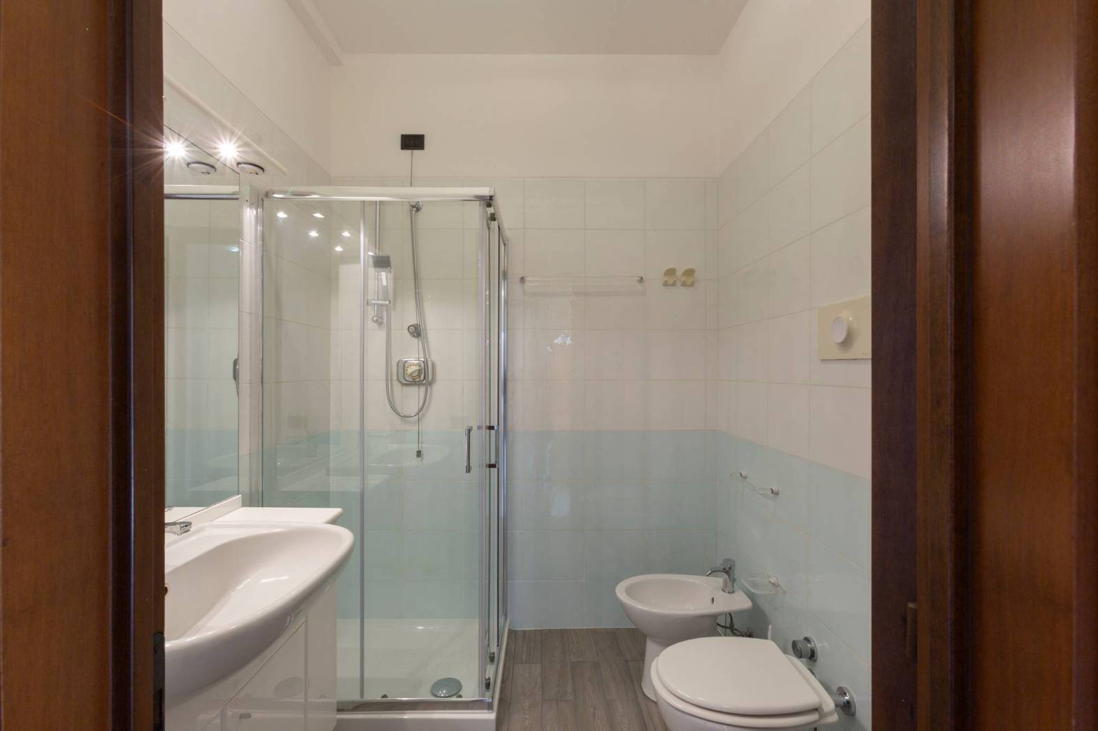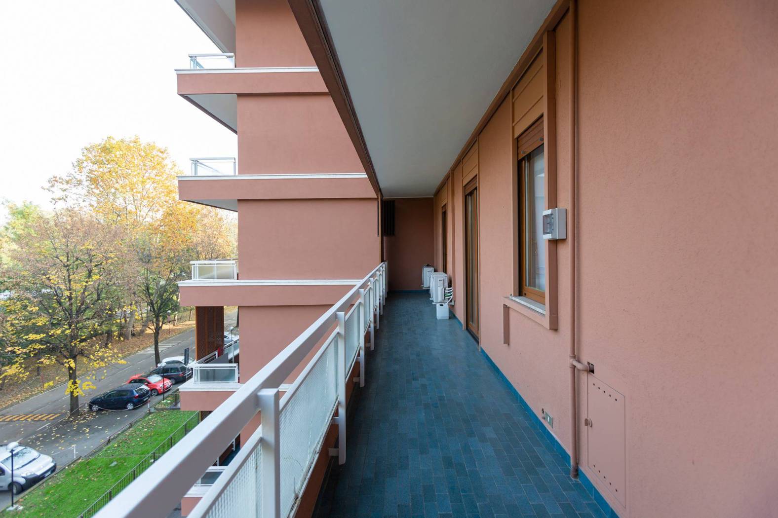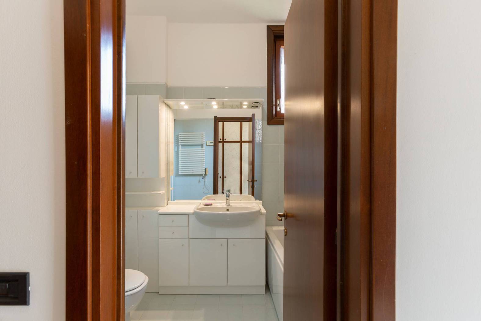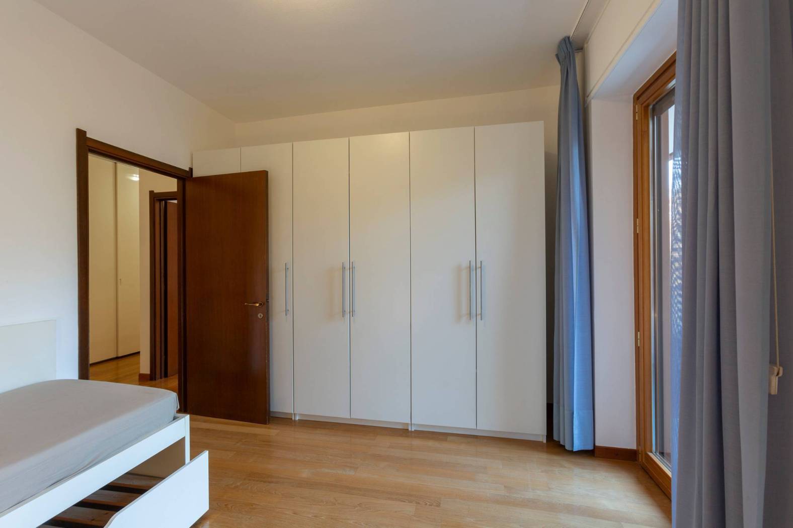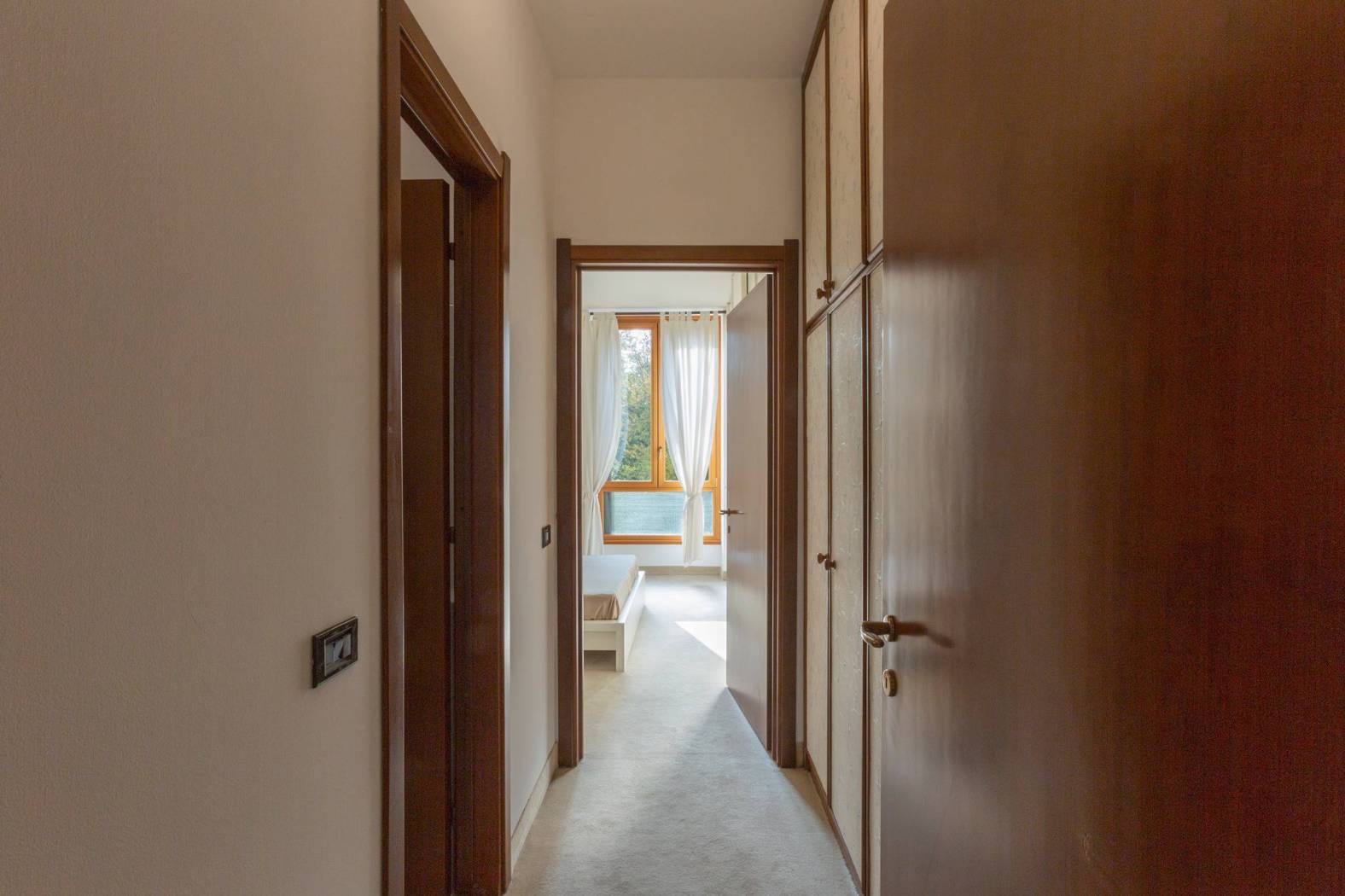 Un corridoio attrezzato conduce alla zona notte ove troviamo tre camere da letto. In particolare, la camera padronale dispone di privato spazio distributivo con armadi e bagno personale, finestrato con vasca. Le ulteriori due camere doppie sono servite da un bagno con doccia e si affacciano su un lungo e godibile balcone.