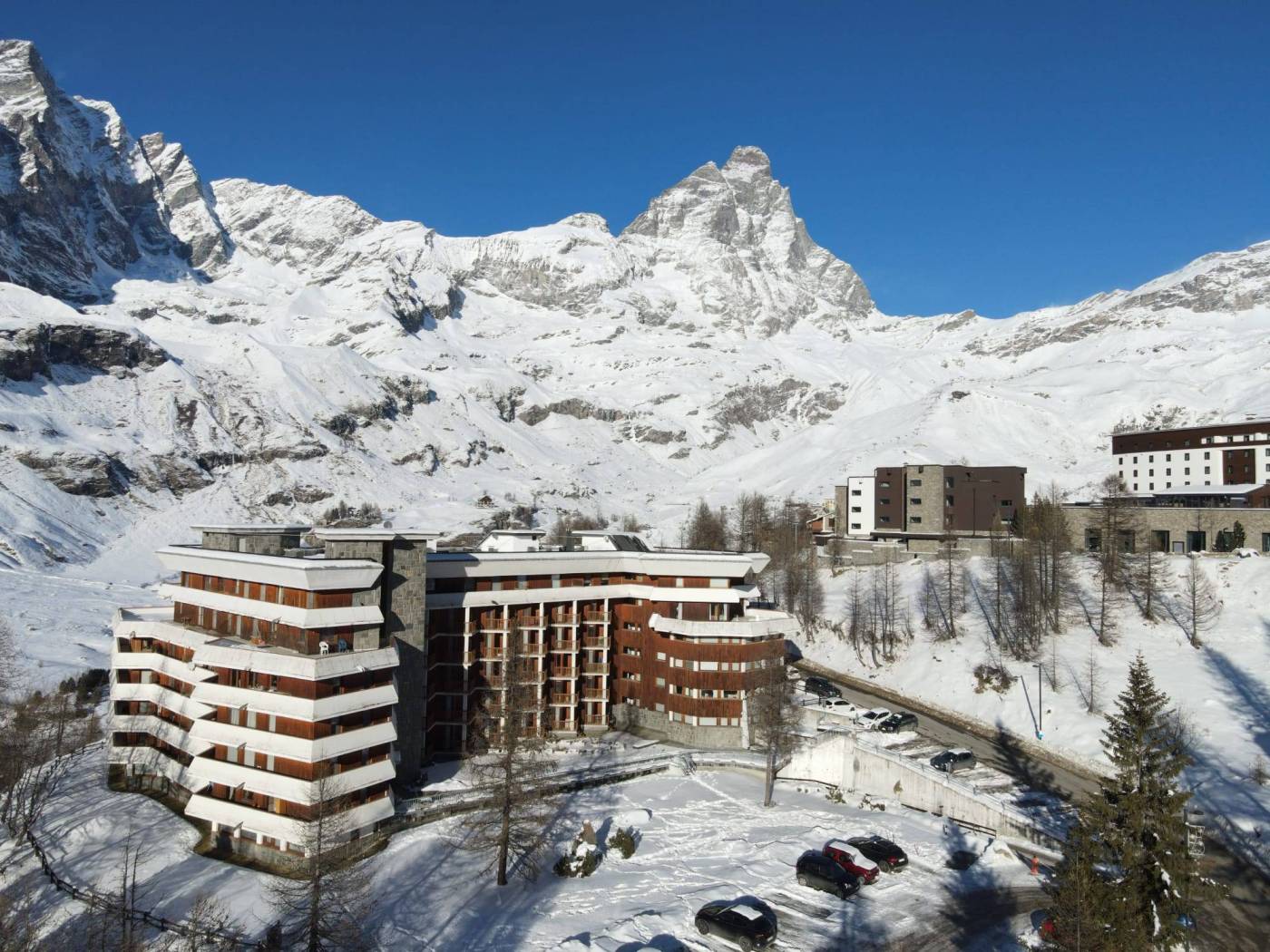Il condominio “Cristallo”, apprezzato per la sua vicinanza al centro paese, si colloca della zona più verdeggiante di Cervinia, all'inizio di vari percorsi escursionistici e gode di vista panoramica sulla catena delle Grand Mourailles e sul Cervino.