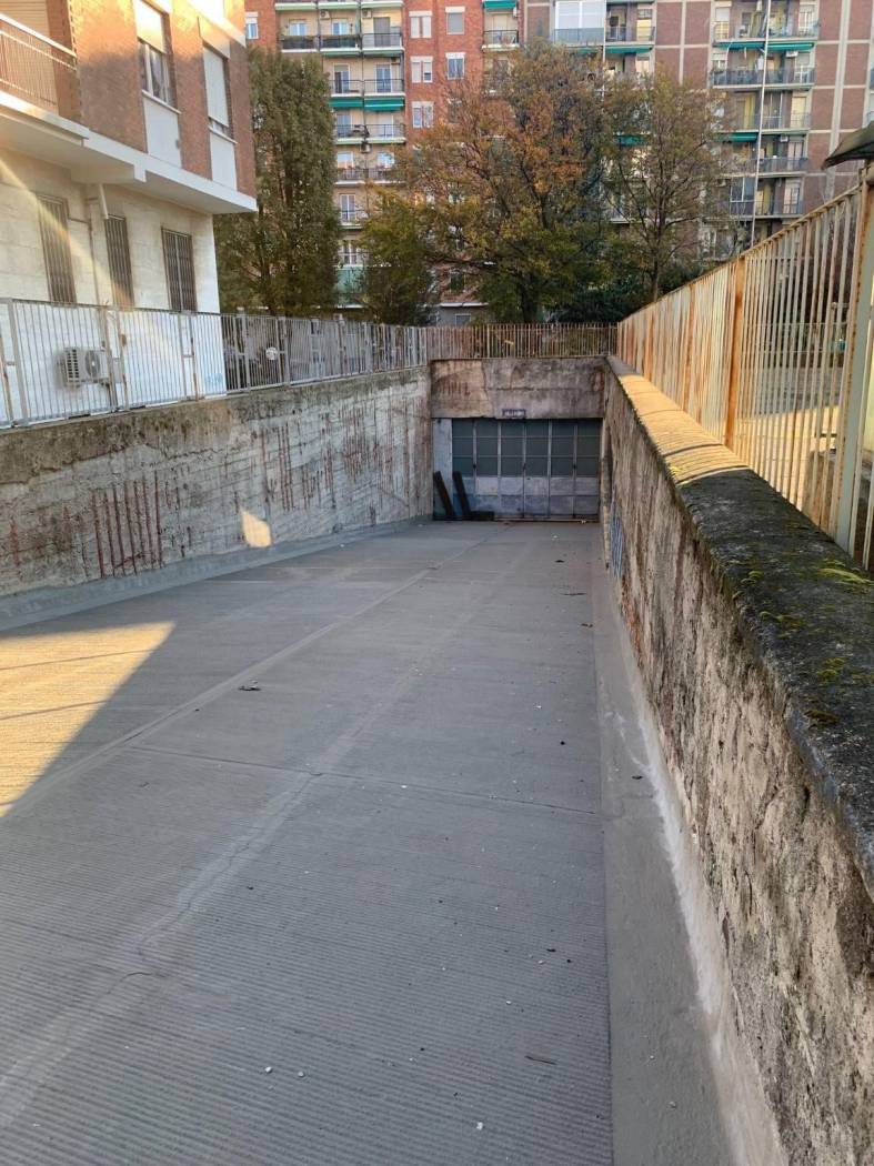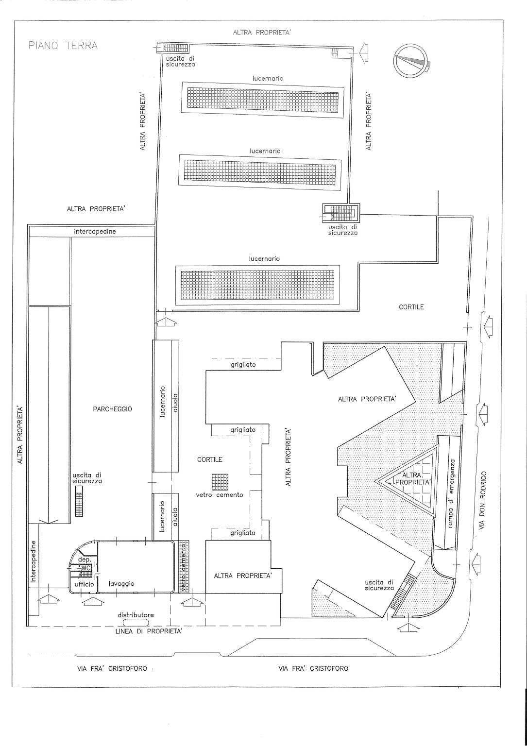 Da due rampe carraie e un ingresso pedonale si accedere al piano interrato di circa 3600 mq. in passato utilizzato come autorimessa con officina, lavaggio auto, uffici, magazzini e servizi.