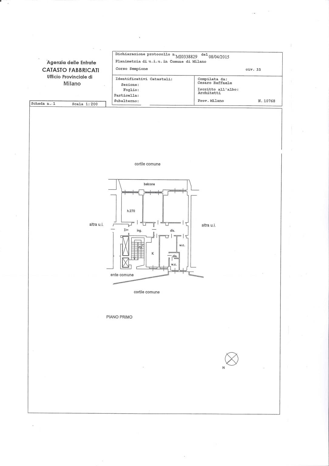 L'appartamento di 115 mq è collocato al primo piano “nobile”, vista l'elevata altezza dell'ingresso condominiale, gode di un'ottima esposizione est-sud-ovest e le sue particolari ampie vetrate panoramiche garantiscono luminosità a tutto l'appartamento con pregevole vista sugli alberi di alto fusto presenti nella via confinante chiusa al traffico con vista anche su Corso Sempione, oggetto di attuale riqualificazione con creazione di un percorso pedonale e ciclabile di collegamento tra il Parco Sempione e il complesso City Life.